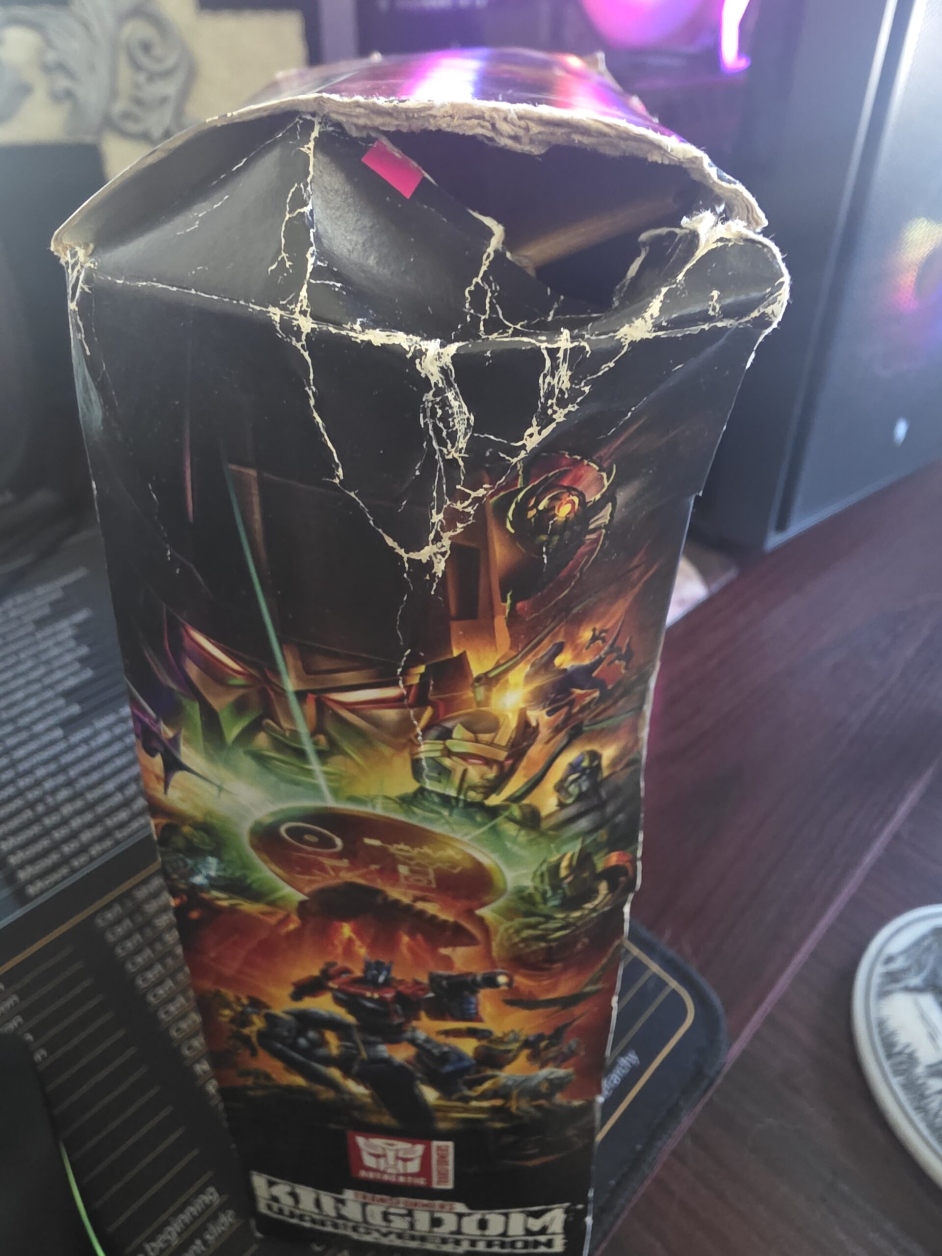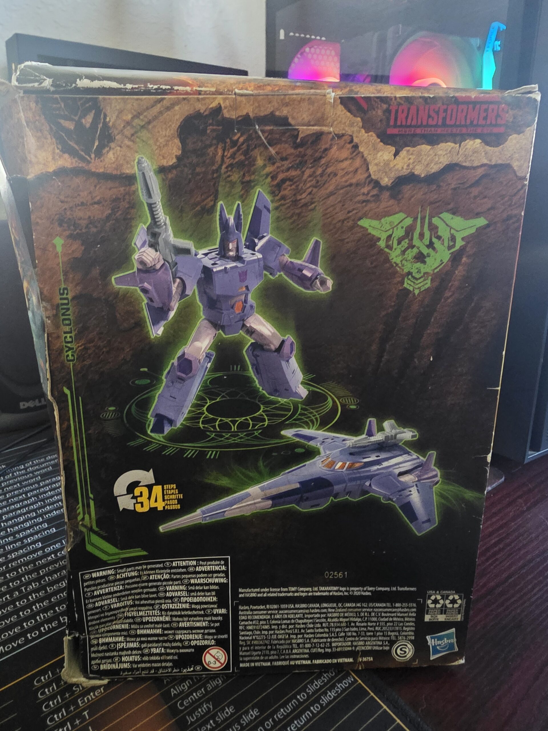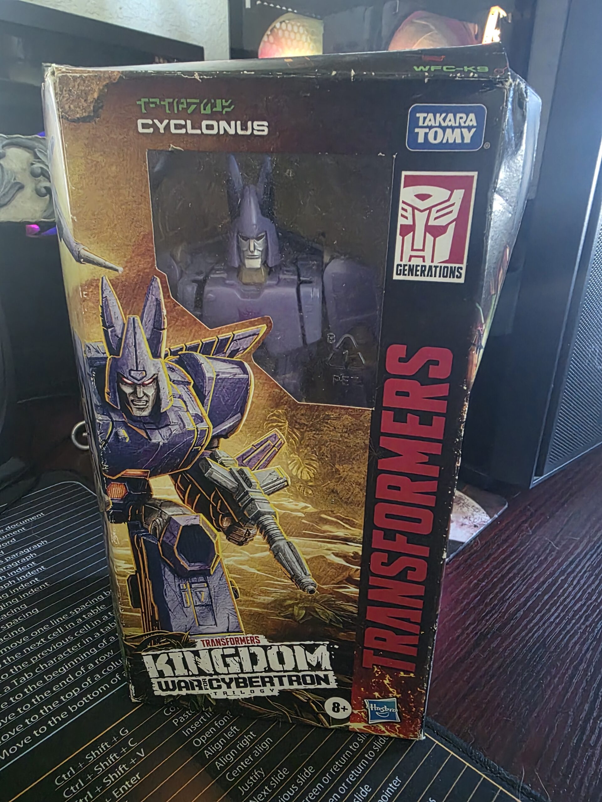 Cyclonus in Kingdom embodies a faithful continuation of his G1 persona, both narratively as a Decepticon operative and in collectible form as a highly detailed, multi-functional Voyager-class action figure suitable for display, play, and story immersion. Item is mint in box unopened but, due to storage the box has damage.